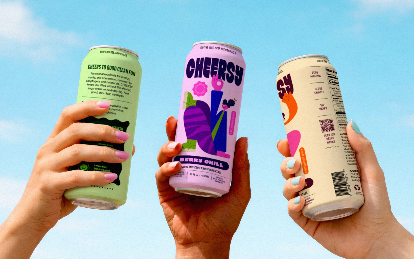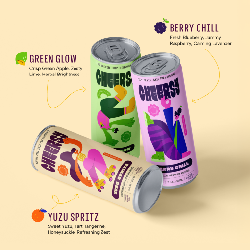 We created distinct character and flavour expressions to align with how people want to feel, energized, calm, or fully present. Through colour, illustration, and contrast, Cheersy stands out in a category often dominated by minimalism. It’s a brand that meets today’s intentional drinkers with personality, purpose, and something to celebrate.