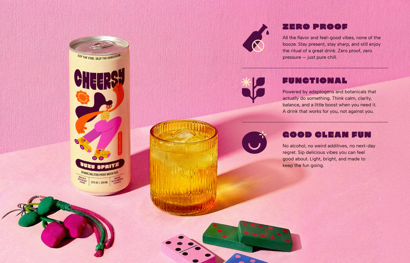 Cheersy is a functional beverage imagined for the sober-curious and vibe-forward socialites. Designed to bring fun to the party without the hangover, it’s made with a bold blend of sparkling botanicals, adaptogens, and feel-good ingredients. Mondu developed a loud, playful identity with cheeky copy, vibrant visuals, and shelf-stopping design that makes wellness feel exciting.